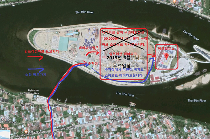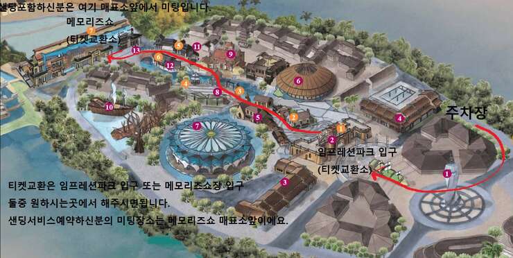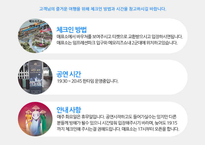 <편도 픽업포함상품 안내사항> (입장권 + 편도픽업) 상품을 이용하시는분은 예약하실때 미팅장소를 적어주시면 해당장소로 기사님이 픽업을 갑니다. 호텔로비에서 미팅할경우 로비에 계시면 기사님이 고객님 성함 적힌 피켓을 들고 기다리고있습니다. <픽업시간 안내> 호이안 호텔 : 19:00 다낭 호텔 : 18:30 반펄 남호이안 : 18:30 - 원하실 경우 조금 더 일찍 출발하실수도있습니다. (임프레션파크에서 시간보내실 분)미리 문의 남겨주세요. - 복귀차량도 원하실 경우 예약하실 때 추가옵션을 체크해서 예약신청해주세요. 다만 편도요금만 포함이라 샌딩요금은 기사님께 직접 지불해주셔야 합니다. <쇼 끝나고 복귀하는 차량요금 : 왕복으로 미리 선택하신 분들만 적용> - 소형차 : 호이안(150,000동), 다낭(200,000동), 남호이안(200,000동) - 벤 : 호이안(200,000동), 다낭(300,000동), 남호이안(300,000동) - 승합차 : 호이안(300,000동), 다낭(400,000동), 남호이안(400,000동) <인터컨티넨탈 다낭, 랑코, 머큐어 프렌치빌리지바나힐 호텔의경우 아래 추가요금이 편도당 있습니다.> 인터컨티넨탈 다낭 : 편도당 100,000동 랑코(앙사나, 반얀트리, 베다나) : 편도당 500,000동 머큐어 프렌치빌리지 바나힐 : 편도당 200,000동 티켓교환소는 임프레션파크 입구와 메모리즈쇼장내 두군데 위치하고있습니다. 지도참고 ↓